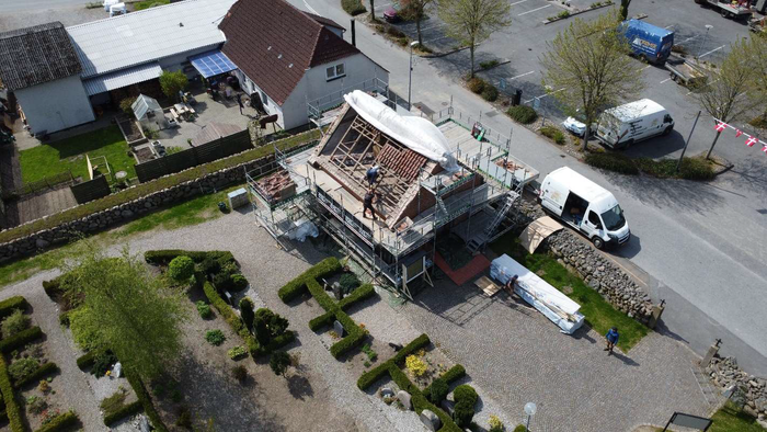 Når stenene er kommet kan murer komme videre med reparationen af gavlene og tagsten kan blive oplagt.